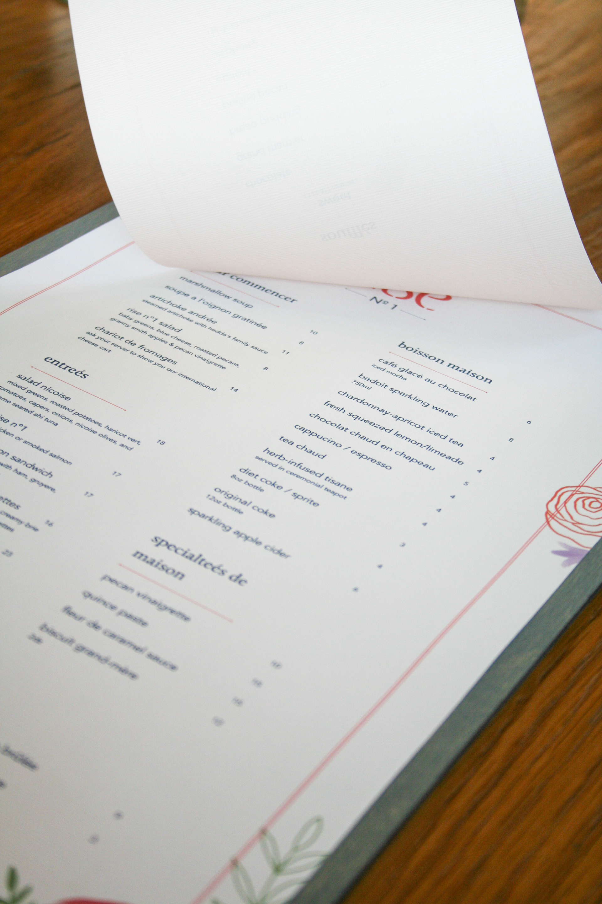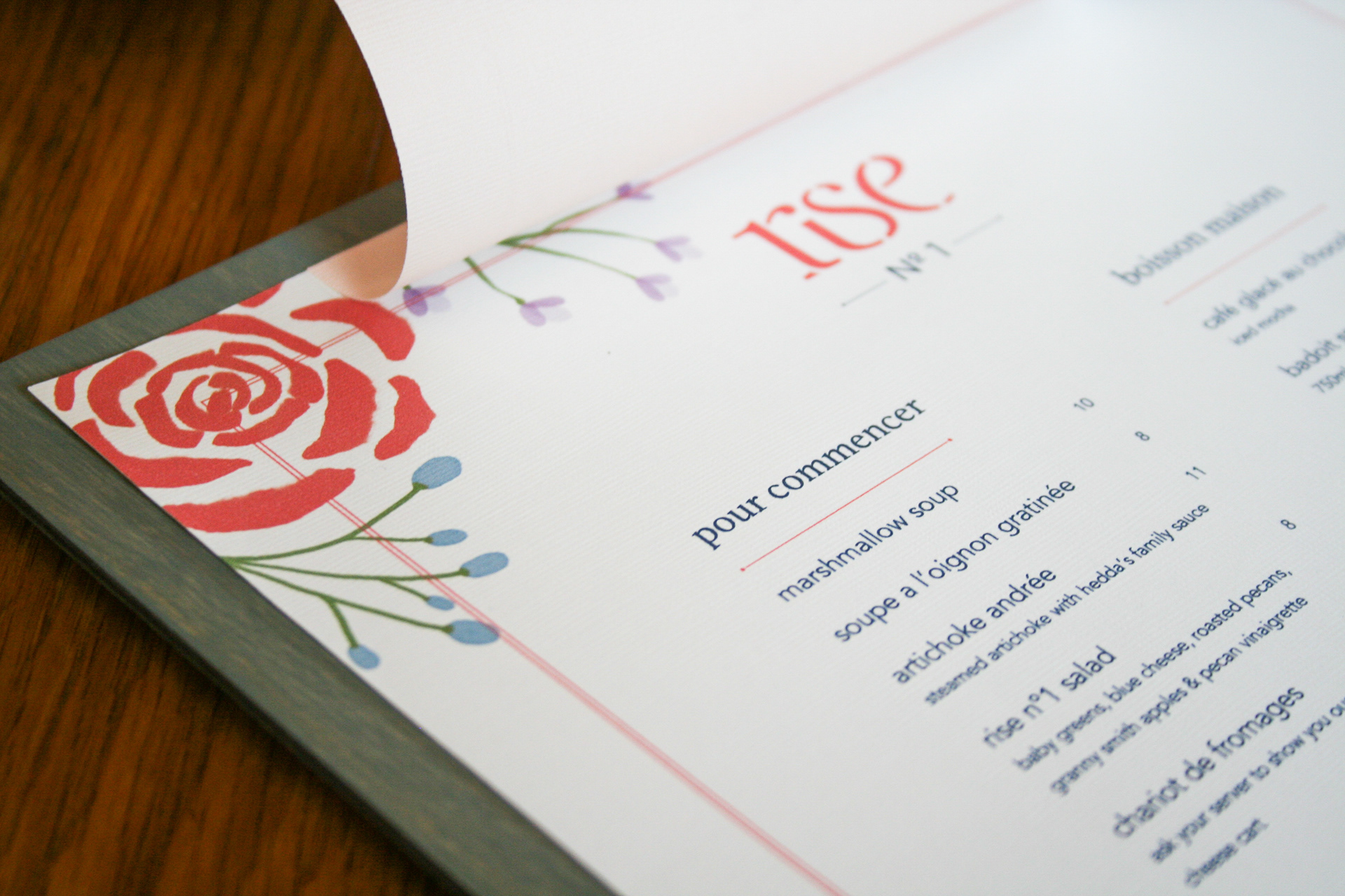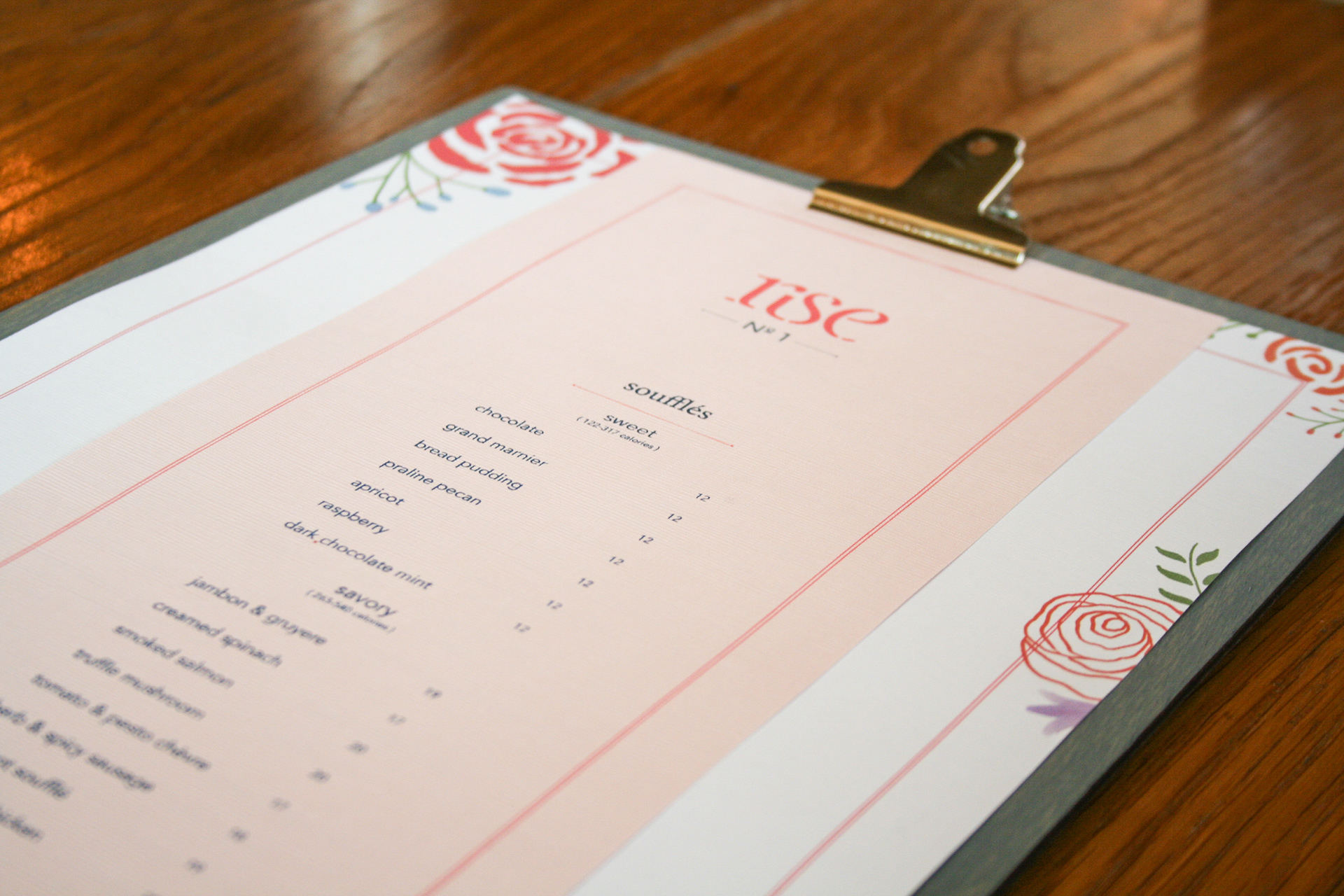 Rise No. 1 is a chic French bistro in the Dallas area specializing in sweet and savory soufflés. Inspired by the warm and whimsical decor of Rise No.1's interior, this menu redesign paired delicate type with charming floral watercolor illustrations. This menu redesign was part of a group effort with a classmate, Kori Webb. My role involved ideating and redesigning a new logo mark for Rise No.1, as well as creating illustrations used throughout the menu design.
